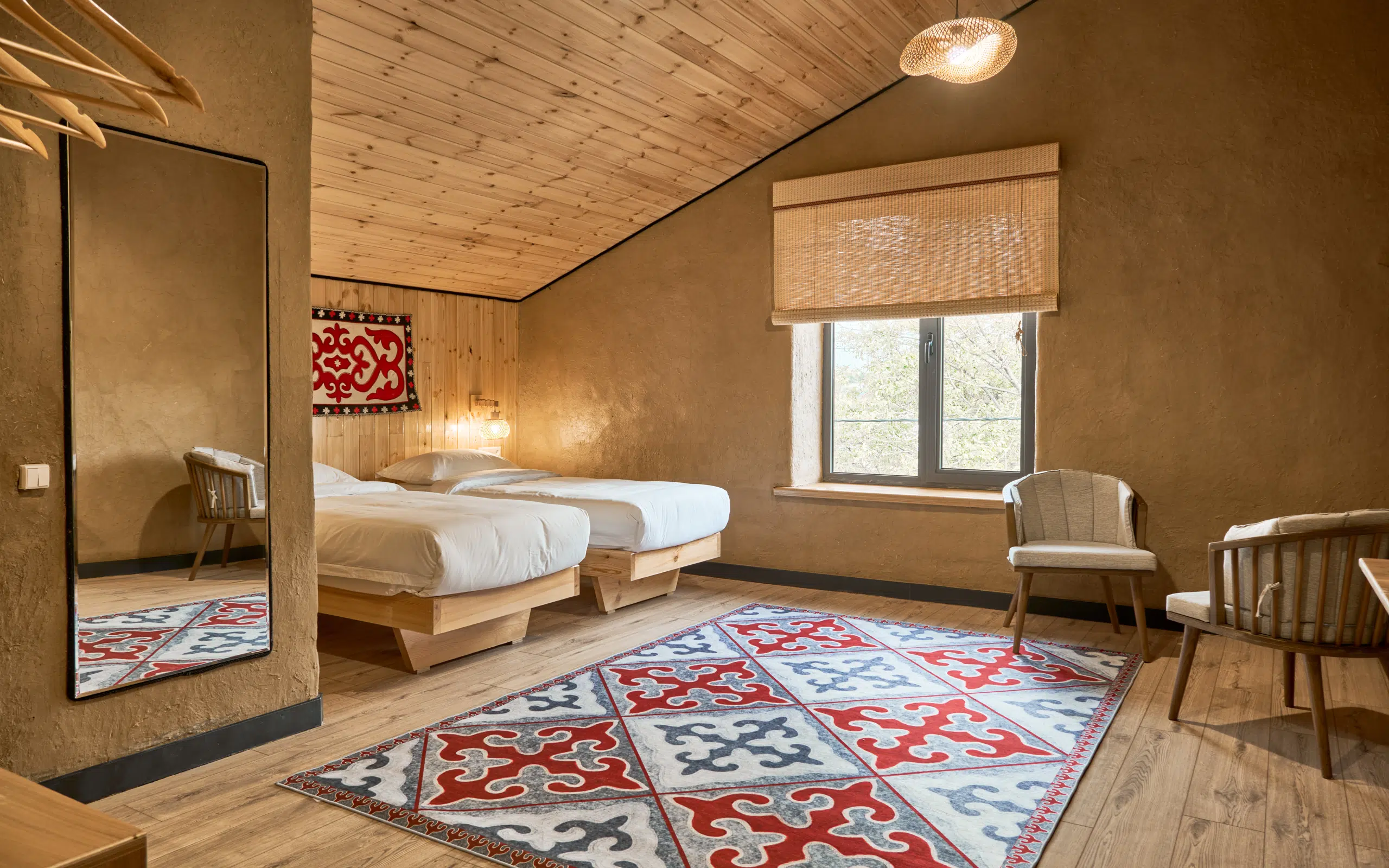 Добро пожаловать в "Pristine" — эко-этно отель в самом сердце Бишкека, созданный из природных соломенных панелей, глины и традиционного кирпича. Это место уединения и тишины, где каждый элемент наполнен духом кыргызской культуры.